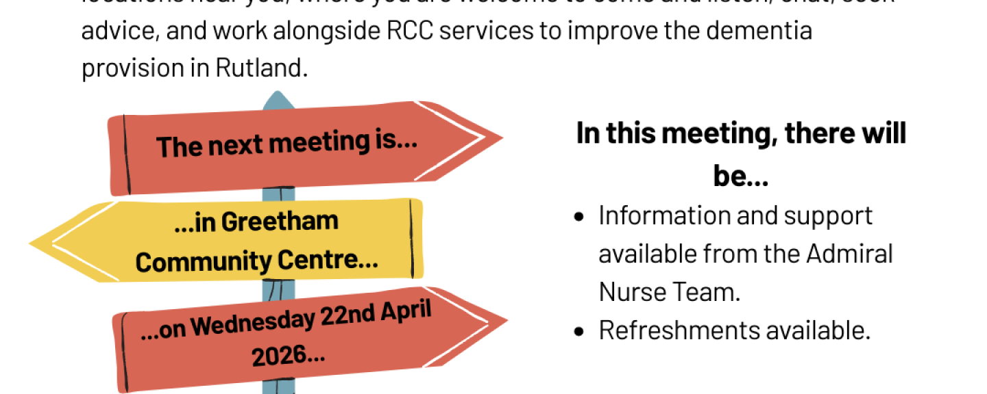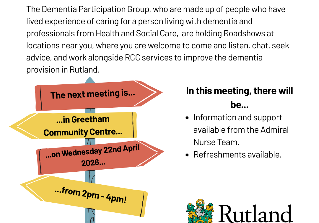 The Rutland Dementia Participation Group invites you to a supportive session offering insight from people with lived experience of caring for someone with dementia and the chance to help shape dementia support services locally. Admiral Nurses will be on hand for advice and information.